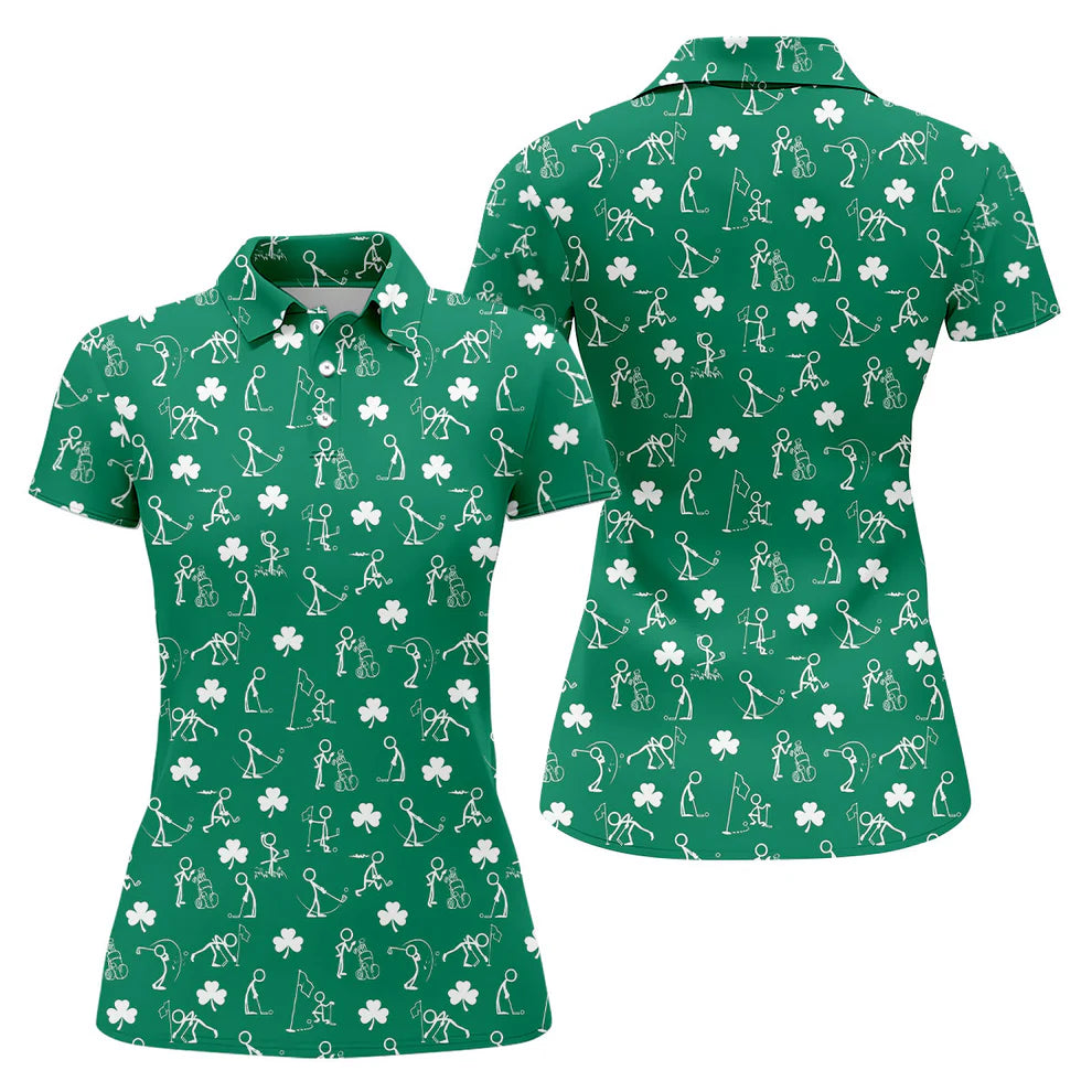 Stick Figure Golf Pose St Patrick's Day Shamrock Green Golf Shirt, Women's Golf Tops