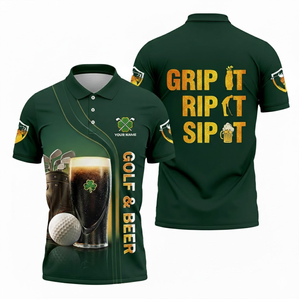 Personalized Grip It Rip It Sip It Golf And Beer St Patrick's Day Green Polo Shirt, Golf Gift For Men